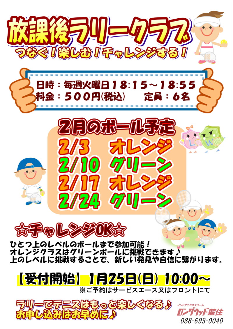 ジュニア放課後ラリークラブ2月期開催のお知らせです🎾