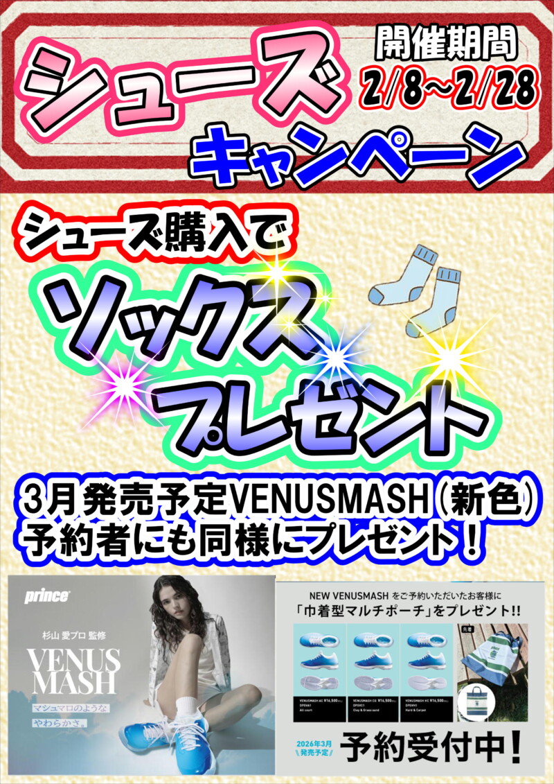さらに、3月発売予定の「VENUSMASH」をご予約いただいた方にも、同様にソックスをプレゼント!