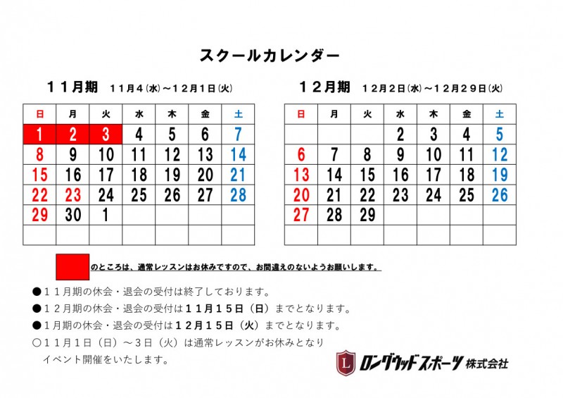 12月期の休会・退会の受付は11月15日(日)までとなります。