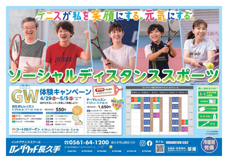 ぜひ、GWはロングウッド長久手校でテニスを楽しんで下さい!