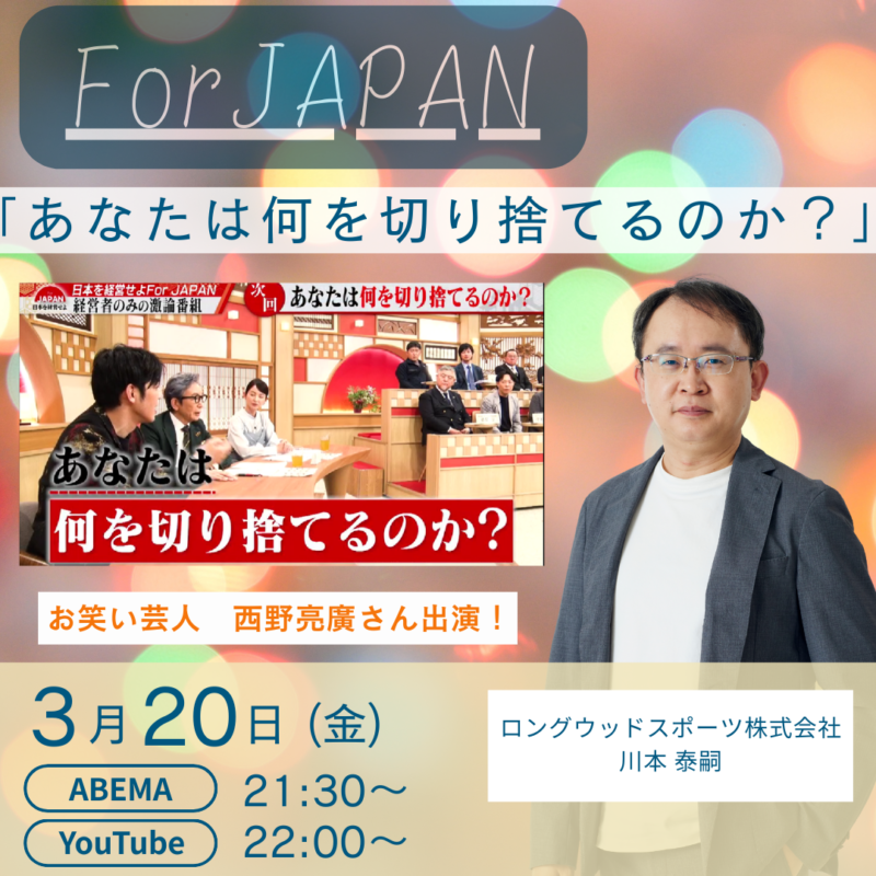 ABEMAのTV番組「FOR JAPAN」川本社長出演。