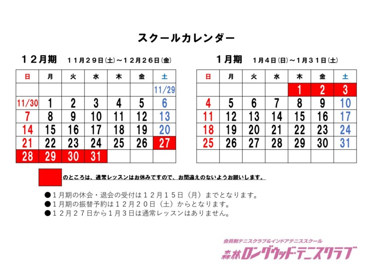12月27日(土)から1月3日(土)までは通常レッスンはお休みとさせていただきます。