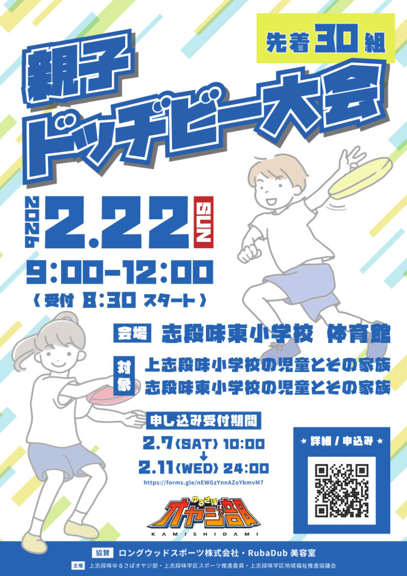 2月22日(日)に志段味東小学校体育館にて、ゆるさぽオヤジ部主催の『親子ドッチビー大会』が開催されます!