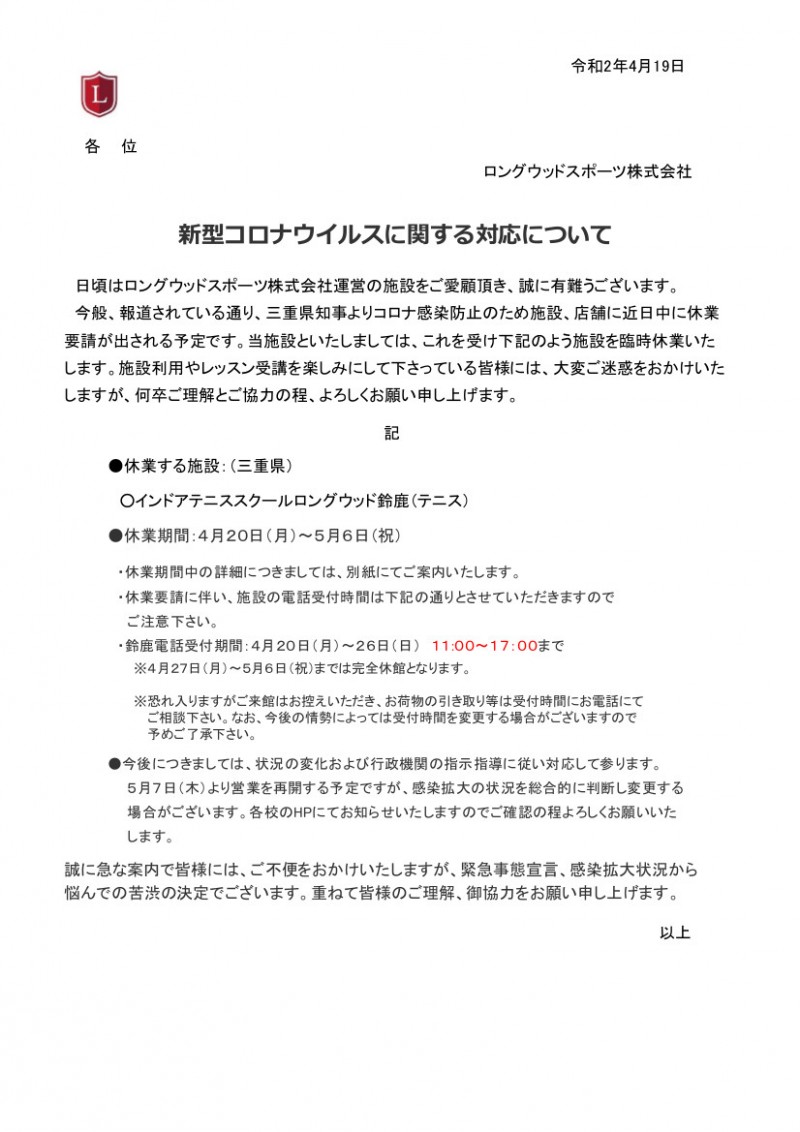 三重県発令予定の休業要請の対応についてPDF形式(ロングウッド鈴鹿)