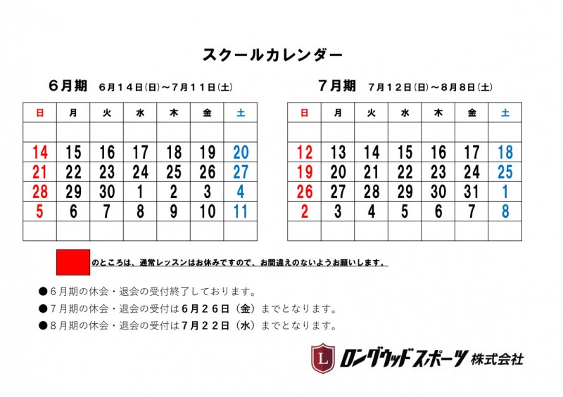 6月期、7月期の開始日や、休・退会の受付締め切り日にご注意ください。