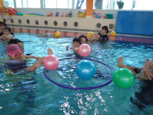 ヌードルを使って、電車ごっこやバタ足などをしながら
