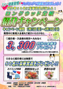 ホーム スタッフブログ一覧 ☆全校紹介キャンペーン実施します☆ お知らせ 2026.2.7 ☆全校紹介キャンペーン実施します☆ 2月15日(日)から全校紹介キャンペーンを実施いたします!! 「新しい習い事を始めたいな」 「運動不足を解消したいな」 そんな方を、是非、ロングウッドにお誘いください!! ご入会いただけると・・・ ①紹介者様とご入会者様に3,300円分の金券プレゼント! ①ご紹介者様の中から抽選で50名様に豪華賞品をプレゼント! 期間は2月15日(日)~4月19日(日)までとなります!! このお得な機会に、ご家族やお知り合いの方をご紹介ください♪♪ 前の記事へ 一覧を見る